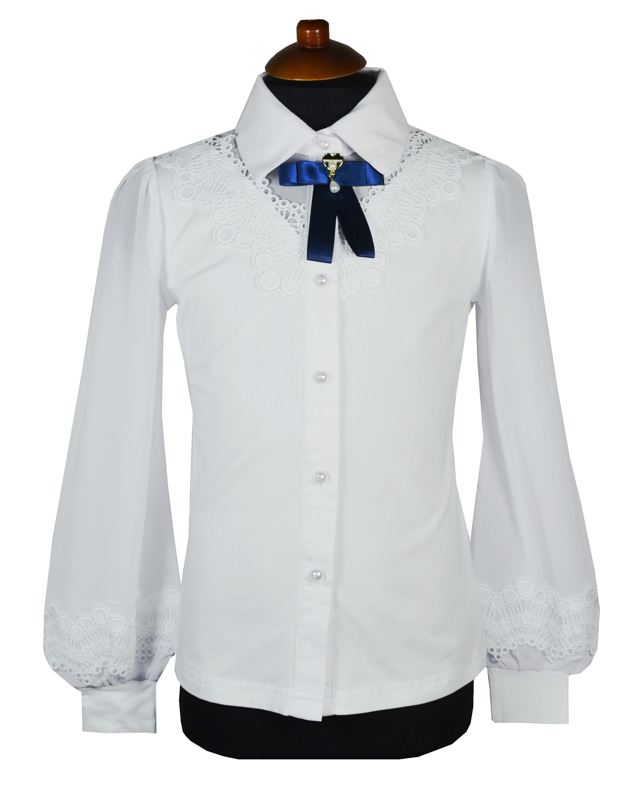 Блузка для девочки из трикотажной ткани. Застежка на пуговицы. Воротник и зона застежки из блузочкой ткани. Рукав выполнен их шифона с вышивкой, манжет из трикотажа. Полочка дополнена кружевным полотном. Бантик-брошь в комплекте. Очень удобная и нарядная.