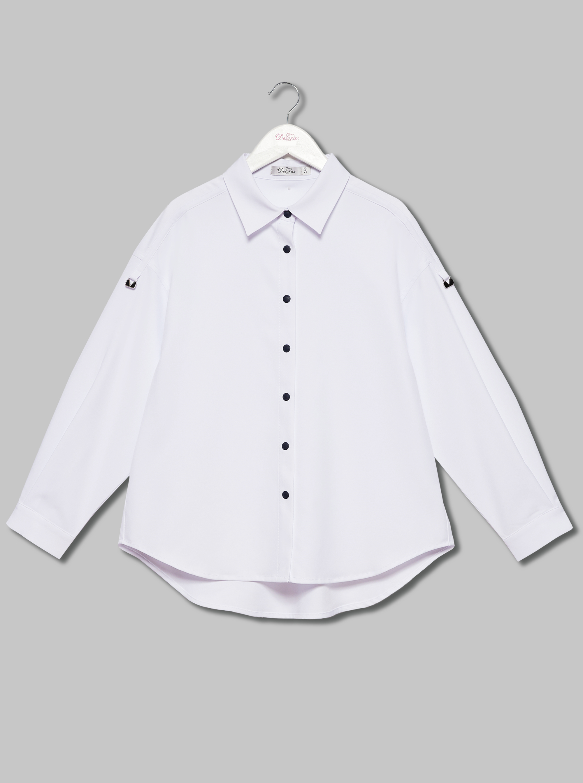 Блузка для девочки с длинным рукавом из премиальной вискозной ткани свободного кроя. Отложной воротник. Застежка на кнопки темно-синего цвета. Спущенное плечо.