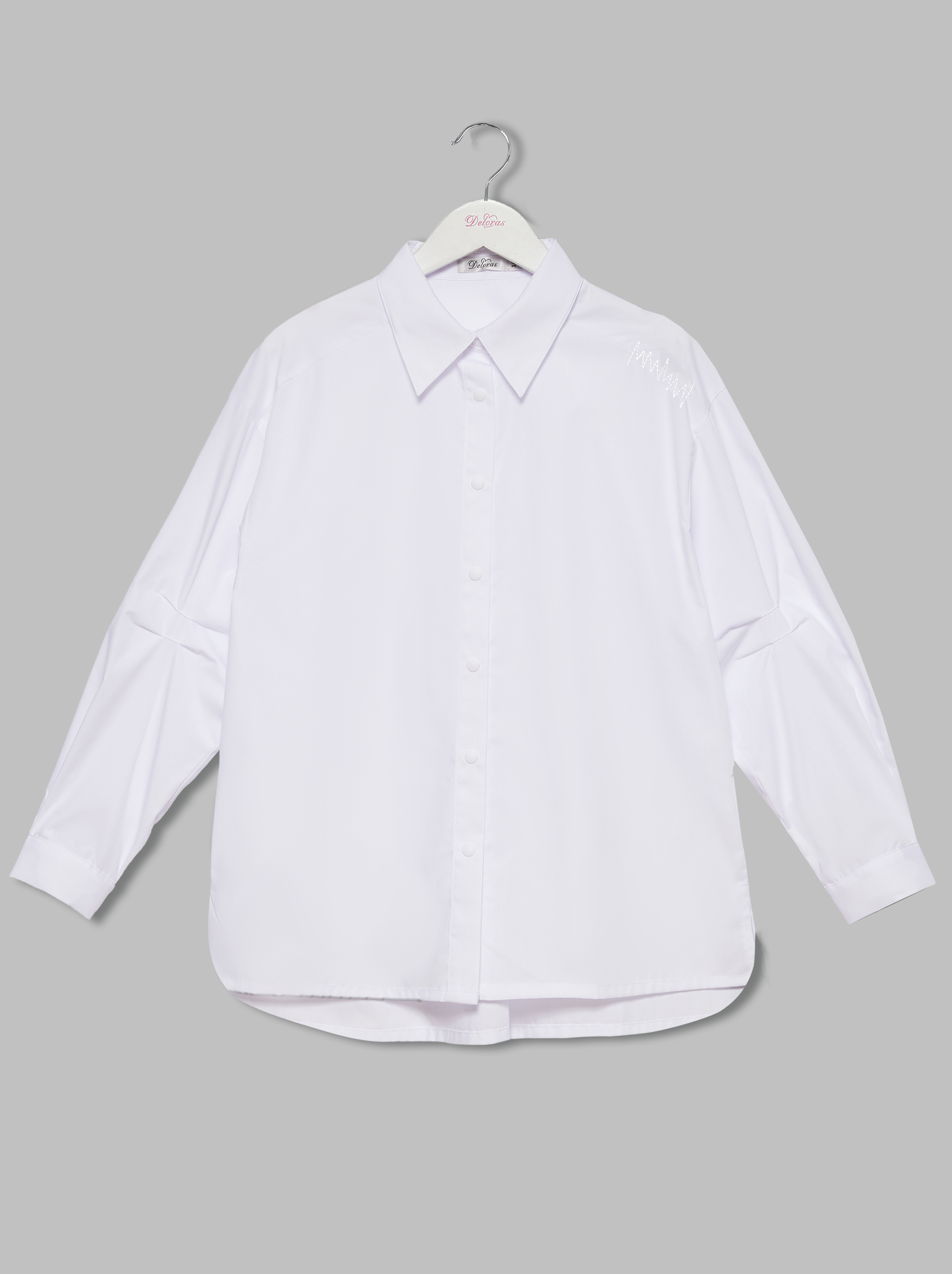 Блузка для девочки с длинным рукавом из премиальной вискозы. Крой свободный. Отложной воротник. Застежка на кнопки. Спущенное плечо. По рукаву защип. По плечу декор белого цвета.