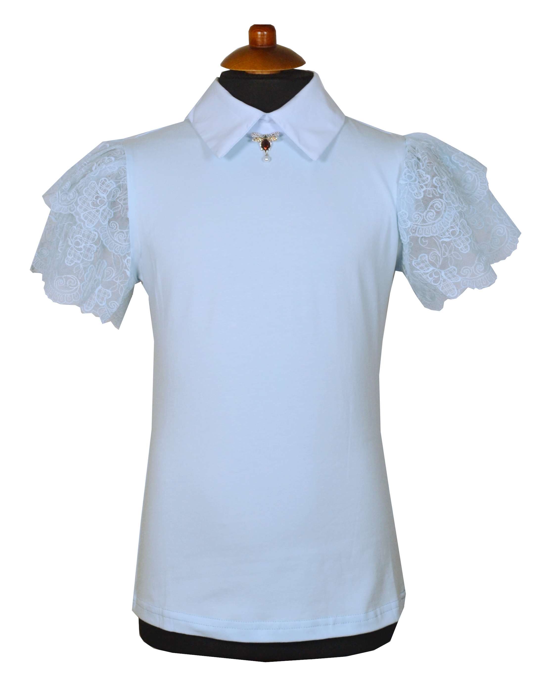 Блузка для девочек из трикотажной ткани с добавлением эластана. Рукав-крыло из плотного кружева, хорошо держит форму. Застежка-капелька на пуговицу по спинке. Воротник с острыми кончиками из рубашечной ткани. Брошь входит в комплект. Качество изделия очень высокое