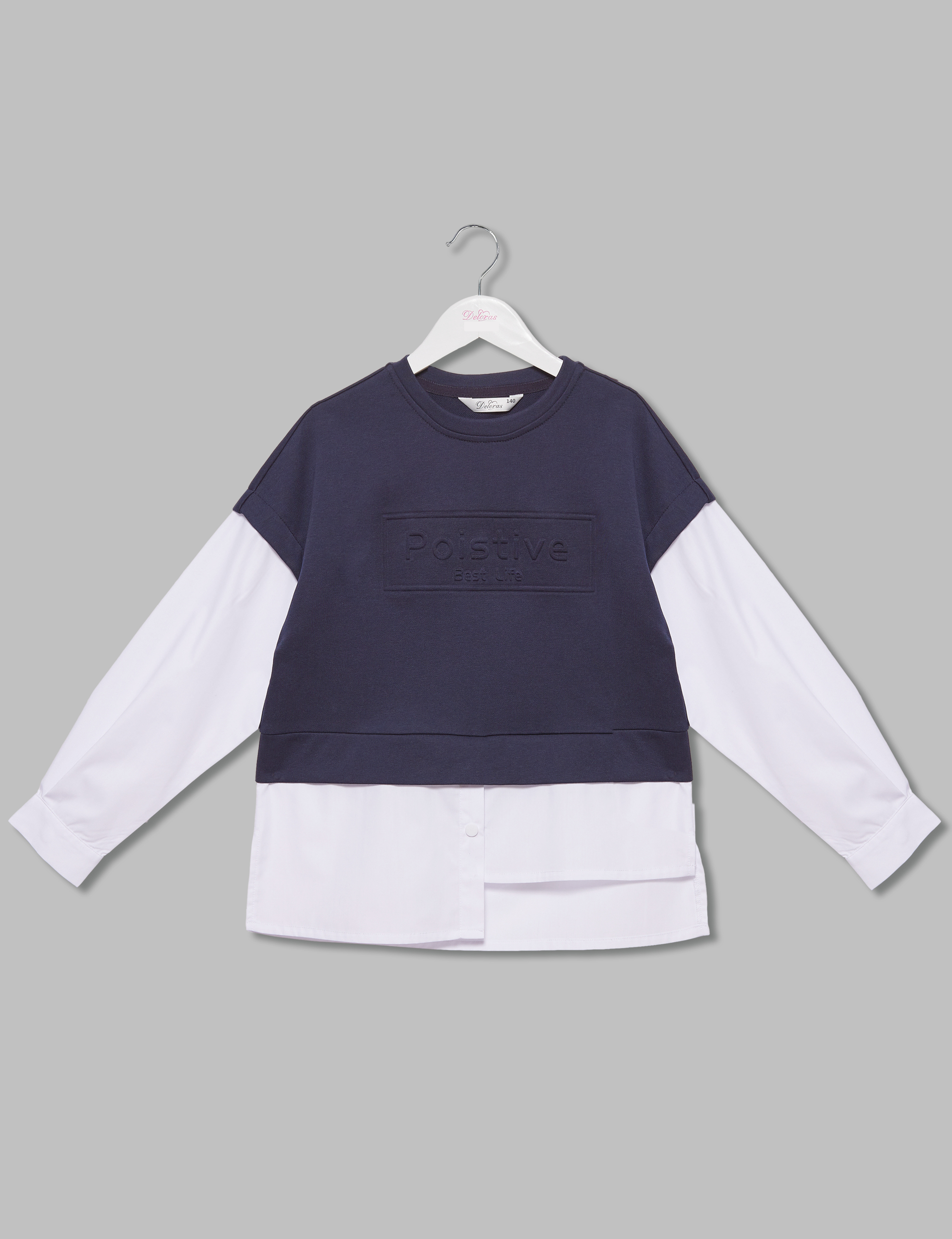 Джемпер-обманка для девочки из трикотажного полотна высокого качества с добавлением эластана. Основная ткань - трикотаж с добавлением эластана. Рукав и низ из блузочной ткани. Спущенное плечо.